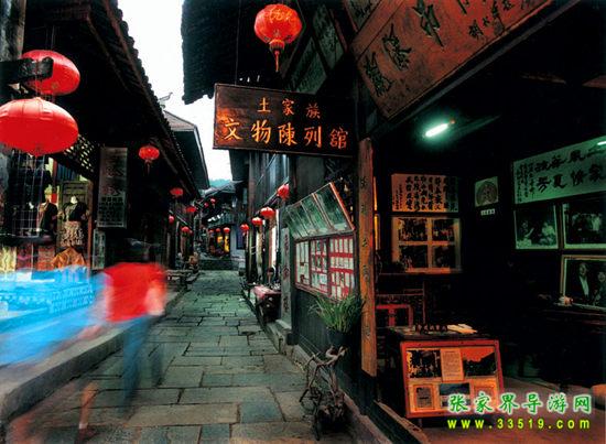 拾級而上,山路一般的陡峭。從碼頭開始綿亙而上的石階,那是一條長達(dá)五里貫穿古鎮(zhèn)的青石板路,它沒有名字,于是人們就直接管它叫五里長街。踏上古街,似乎踩在被悠長歲月遺落的碎片上面。不知不覺走到掛有“土家觀瀑吊腳樓”牌匾的民俗博物館前,從手搖腳踏的棉花機(jī)、閹豬鳴號(hào)的羊角到世代相傳的雕花牙床,近百件散發(fā)著鄉(xiāng)土氣息的民間用具,展示著土家族古老豐富的歷史??醋o(hù)人說,這是一位土家族年輕人爬山涉水收集來的,靜靜地訴說著這個(gè)小村古老的過去。這棟三層的小樓,一半落在河岸上,另一半?yún)s是由水泥柱支撐著,水泥柱直插河底,任水流日日夜夜地沖刷,小小的吊腳樓仍穩(wěn)穩(wěn)當(dāng)當(dāng)站在那里,任憑時(shí)間的流逝。好聰明的土家人,巧借一片水面,竟建起了如此妖嬈的住房。