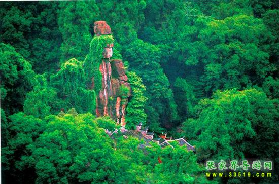 不二門內(nèi)由石灰?guī)r風(fēng)化形成的一尊巨大石佛,聳立于萬綠叢中,高六丈,青冠白面,頭頂白云,腳踏碧水,人們以其形神稱為“觀音巖”。《永順縣志》稱“觀音巖素有‘湘景名峰第一巖’之稱”。觀音巖下,聳立著一組瑰麗多姿、古色古香的殿閣建筑群,這就是“嵩山堂”,包括三觀殿、玉皇閣和禪房客舍,工藝精巧,玲瓏別致。特別是正殿后的地藏庵,與老司城明代建筑祖師殿結(jié)構(gòu)相似,背倚石壁,右通八陣圖,左達熱水坑,周圍怪石森列,古木參天。觀音巖北部山上是天造地設(shè)的“八陣圖”,有的如排戟,有的似春筍;有的像古佛,有的若走獸。八陣圖之奇,不僅在于它林立的怪石,最主要的是在于由龜裂紋石板鋪成的時上時下時隱時現(xiàn)的彎彎小徑——或穿過地下幽深的石洞,或延展于密林雜草叢中,或環(huán)繞于奇峰怪石之間,使八陣圖的東、南、西、北四門相通,復(fù)雜繁多的石徑互相連接形成網(wǎng)絡(luò),人們有時難以找到出路。也許,這就是八陣圖命名的緣由。不二門內(nèi)兩側(cè)石壁開闊如屏,歷代文人墨客或贊山水之幽絕,或抒心胸之豪情,雕鑿了種種摩崖石刻。據(jù)《永順縣志》記載,不二門石刻有神秀獨鐘、吾道南來、白云門開、砥柱中流、眼前南海、百寶勝光、別開生面、別有天地等100多處。歷經(jīng)風(fēng)雨滄桑之后,現(xiàn)僅存鬼斧神工、勝境無雙、滌盡塵氛、瞻奇仰異、海上飛來等數(shù)十處。清代名士白介庵所作《松徑留云》、《古洞仙蹤》、《層閣聳翠》、《玉嶂屏環(huán)》、《澄潭月影》等觀音巖八景詩尚凸現(xiàn)在石壁之上。其中《石門天鑿》一詩完整無缺:“法門高聳五云偎,鬼斧神工妙化裁。鞭石無痕還著相,振山有鐸不須錘。地沾花雨千歧坦,道接薪傳一線開。莫道終南稱捷徑,巨靈神辟小蓬萊。”清代庚辰年間的探花景元,曾在石壁上題刻“到此人皆佛,同來我亦仙”。他還以一筆揮成的“山青海岸”疊字如圖似的符合成一個“岸”字鑿刻在摩崖之上,堪稱罕世之作。石壁上近年來還鐫刻了偉人毛澤東的詩詞和儒將蕭克、畫家黃永玉等巨擘的題字,游人置身其間,飽享山水美景、名勝古跡與文化藝術(shù)的熏陶。