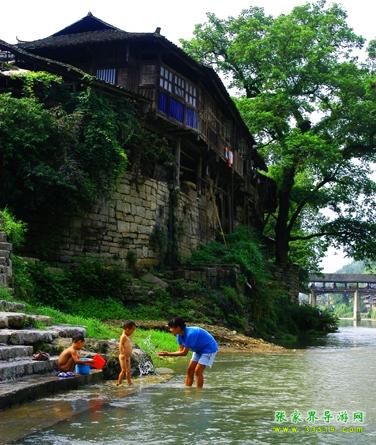 民宅多為吊腳木樓,依山傍水而建,臨河者倒影澄潭如水中街市,依山者雄峙高崖似空中樓閣。兩條河潔凈透亮,其中小河尤為美麗,青山夾岸,綠水長流,河畔蓼紅芷白,桂馥蘭芳,素有“香溪”之稱。其水盡來自溶洞,距街三里之內(nèi),就有魷魚洞、犀牛洞、王家洞、向家洞幾股洞泉和一個叫“雞屎潭”的溫泉。 “雞屎潭”來有濃重的硫磺味,水溫如沸,除污力極強,根本不需肥皂便能將汗?jié)n洗得干干凈凈,并能醫(yī)治瘡疥,維護皮膚健康。河中多魷魚,肉嫩且肥,立冬前盡逆水潛入溶洞起冬,立夏前兩三天則成群結(jié)隊隨夏汛而出,鄉(xiāng)人在洞口安上網(wǎng)壕,只需“守株待兔”,便能得到豐盛的收獲。在20世紀(jì)70年代以前,有時每天可得幾百斤。 小河灘多流急,是漂流的極佳去處。