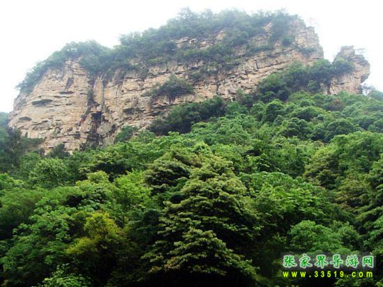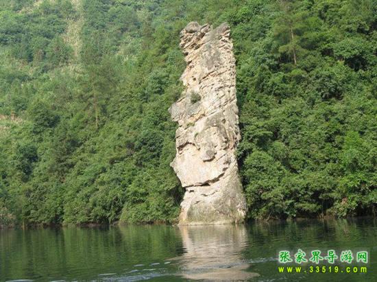 過(guò)了這道石門(mén),眼前豁然開(kāi)朗,只覺(jué)得湖光山色撲面而來(lái)。一只石孔雀正在我們面前展示它美麗的羽毛,半山腰那塊白色的石屏好像羽毛,前面一塊突出的小石峰好像它的頭,好一只美麗的孔雀!有人說(shuō):“孔雀開(kāi)屏,脈脈含情。”也有人說(shuō):“孔雀開(kāi)屏,自作多情。”你猜猜看,這美麗的孔雀是脈脈含情呢,還是自作多情?有人說(shuō)張家界的山石草木都是情種呀。