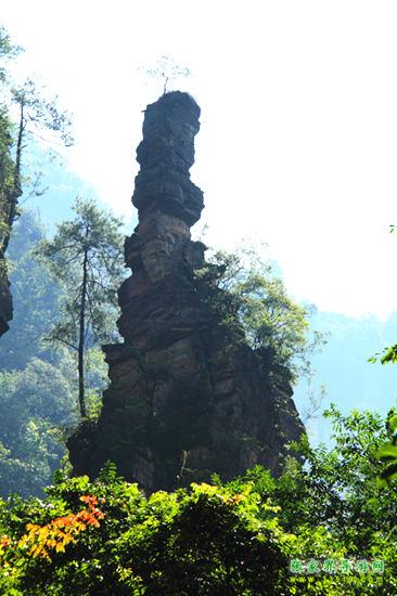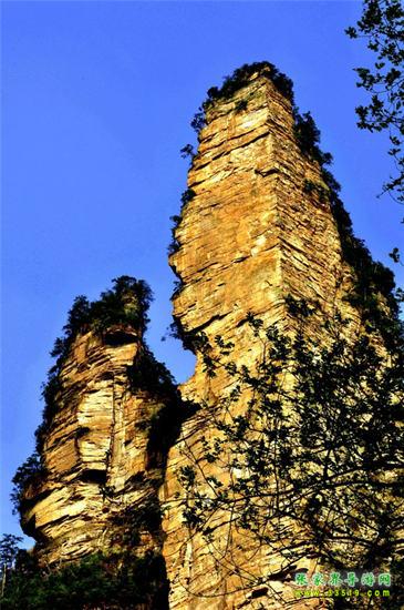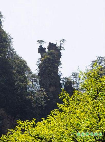 有緣千里來(lái)相會(huì),萬(wàn)水千山總是情。“曾經(jīng)滄海難為水,除卻巫山不是云。”前方這支高300多米的石峰,是不是很像一對(duì)情侶?男的身材高大,頭戴頭盔,身披鎧甲,右手摟著女人的腰,左手撫著女人的肩膀。女的身材豐滿,面容清秀,兩眼深情地凝望著自己的愛(ài)人。兩人含情脈脈、情意綿綿的樣子好像有千言萬(wàn)語(yǔ)三天三夜也說(shuō)不完。您猜猜看,他們是在互相傾訴離別的痛苦呢,還是在相互表達(dá)重逢的喜悅?有詩(shī)人這樣寫道:“半是愛(ài)憐半是悲,少?gòu)能娢槔戏交亍T憧粪ㄆ鼘④姕I,化作春風(fēng)滿谷吹。”相傳這男的是明代抗倭?xí)r一位土家族將軍,一打完仗就千里迢迢,風(fēng)塵仆仆地趕回來(lái)和愛(ài)人相會(huì)。他連頭盔和鎧甲都沒(méi)來(lái)得及換!這女的自從和心愛(ài)的情人離別后,朝思暮想,茶飯不思,“衣帶漸寬終不悔,為伊消得人憔悴”。她清秀的臉上仍顯得有幾分憔悴,卻格外楚楚動(dòng)人!此情此景,您看到了嗎?您看到的是石頭,還是愛(ài)情?山風(fēng)吹在石壁上的聲音和著金鞭溪的流水聲,好像一聲聲祝福:祝您愛(ài)情美滿!愿天下有情人終成眷屬!