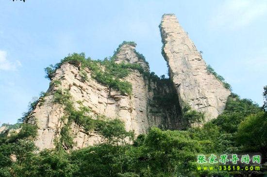 說(shuō)到討好老婆,豬八戒可謂這方面的專家。您回頭看,不遠(yuǎn)處一支長(zhǎng)有一些小樹(shù)的石峰,頂部分了丫,像一個(gè)英文字母“Y”,很像頭戴綠色小帽的豬八戒背著他身材嬌小的老婆(有人開(kāi)玩笑說(shuō)他戴的是“綠帽子”,背的是“小老婆”)。小老婆撐著一把小陽(yáng)傘,還正在背上一扭一扭的呢!八戒的嘴最形象,嘟得老長(zhǎng),好像背了很久,累得不行了,正喘著粗氣——您千萬(wàn)可別看不起豬八戒先生,他魅力足著呢,他不但能吃會(huì)玩、開(kāi)朗大方,而且溫柔多情,雖說(shuō)長(zhǎng)相“安全”了一點(diǎn),但特別擅長(zhǎng)哄女孩子開(kāi)心,不少窈窕淑女就喜歡他這種“好逑的君子”。