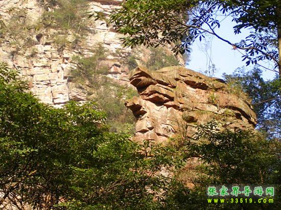密林中有兩塊石頭,很像兩只龜重疊在一起,探頭探腦的樣子,正向著金鞭溪爬去。有人說(shuō)這是“夫妻雙雙把家還”。這兒有一個(gè)荒誕的故事:億萬(wàn)年前的一個(gè)晚上,海龍王通知居住在這一帶的蝦兵蟹將及所有手下,明天天一亮海水就要消退了,必須全部及時(shí)撤走。這兩只情龜只顧著花前月下,把海龍王的話當(dāng)耳邊風(fēng),第二天早上起床,望著海水已經(jīng)遠(yuǎn)遠(yuǎn)地退去了,后悔莫及。他們爬呀爬,只希望有一天這溪水能把他們帶回大海。有的人有不同的“版本”:這兩只龜藏在這深山老林干什么呢?為了躲避“計(jì)劃生育”。張家界像烏龜?shù)?hellip;峰很多,那都是它們干的好事呀!