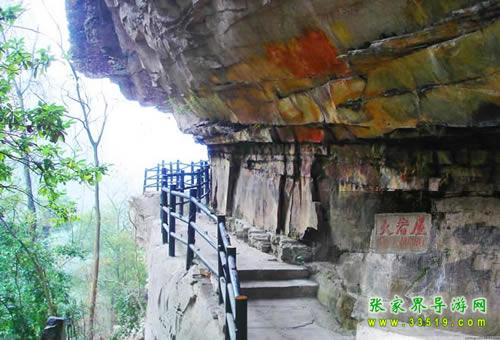 羅漢迎賓上方西南側(cè)石壁上,有一處空間高約3米、深1-3米、長20多米的巖屋,是絕妙的觀景臺(tái)。登臺(tái)南眺,遠(yuǎn)山如黛。近處左上側(cè)有石峰數(shù)座,倚天而列。北邊一峰類人,西向側(cè)面而立,似頭著兜鍪,身披甲胄,左臂下垂,傲視藍(lán)天,游人戲稱“獨(dú)臂武將”。巖屋下20米,一峰如葫蘆豎立,高約30米,直徑約10米,底、肚、頸、口俱全,附生的草木如花紋圖飾,一塊重達(dá)數(shù)噸的石板蓋于口上,稱”仙丹葫蘆“。對(duì)面一組山峰形如駱駝踽踽東行。駱駝前方是一山坡,有草無樹,夏日青似草原,秋天黃如大漠,駱駝?wù)蚰抢镒呷ァ?/p>