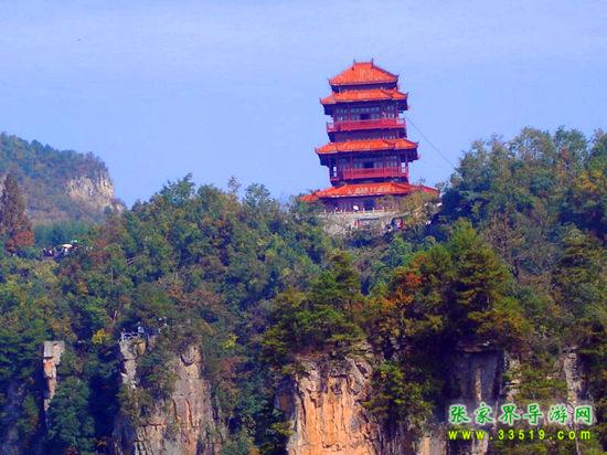 這是六層四重檐穿頭式仿古建筑,高30米,由深圳市政府捐建。建立之初,本打算取名叫“深圳閣”,但遭到許多人(包括深圳人)反對,認(rèn)為這樣與整個(gè)天子山的風(fēng)景不是很協(xié)調(diào)。不過從另一個(gè)角度來看,深圳人這種“經(jīng)營城市”的意識,卻非常值得張家界人學(xué)習(xí)。“欲窮千里目,更上一層樓”,登樓遠(yuǎn)望,天子山群峰盡收眼底,別有一番風(fēng)景。