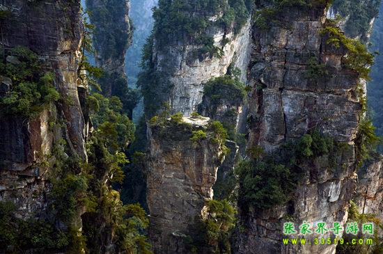由于它地勢高,東南西三面都可觀景,透視線長,畫面寬闊,景觀層次多。在天子山的天子峰或七星山上居高臨下,俯瞰腳下成千的感受。天子山山體中部高,四周低,似一座巨型寶塔拔地而起。各類新發(fā)育的造型奇特的地貌,多集中天子山山腰, 如雄偉的瀑布、奇險(xiǎn)的仙 人橋、巖門、溶洞,密集而陡峭的峰林石柱等,又使游人的獵奇心得到最大的滿足 。