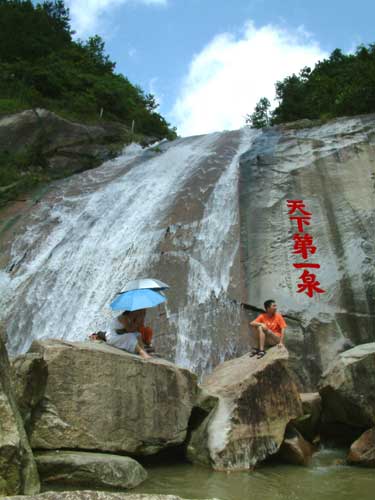 水簾洞瀑布源頭,在紫蓋峰的泉水。三支泉水匯集一起,流入水簾洞上方谷地。谷地闊三丈,原是梁朝的九位真人白日飛升的棲息之地,后建造九仙觀。九仙觀附近有太陽(yáng)泉、洗心泉、洞真源、仙人池等。相傳泉水深不可測(cè)。泉水從石壁上飛流直瀉,發(fā)出雷鳴般的聲音,聲傳十里。明朝張居正游此地后說(shuō):“瀑泉灑落,水簾數(shù)疊,掛于云際,垂如貫珠,霏如削玉”。確實(shí),它從絕壁上噴瀉下來(lái),寬達(dá)三太,高五十余米,瀉珠濺玉,仿佛一幅巨大的白布簾,在石壁當(dāng)中被亂石嶙巖擋住,然后再?gòu)氖p里屈曲折射,跳躍出來(lái),滿谷水花四濺,閃爍著晶瑩奪目的光彩。水簾絕壁下的碧潭,天上的云彩和兩邊的蒼翠的山巒,構(gòu)成一幅美麗的山水畫(huà)。明朝張居正作《水簾洞》一贊道:“誤疑瀛海翻瓊浪,莫擬銀河倒碧流;自是湘妃深隱處,水晶簾掛五去頭”。這首詩(shī)可說(shuō)是寫(xiě)出了水簾洞的光、聲、影三絕的奇景了。