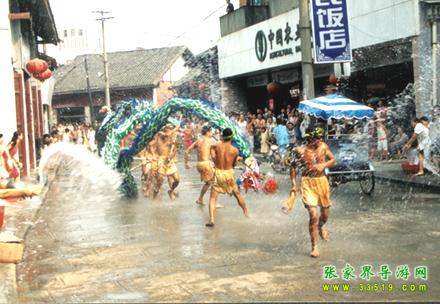 張家界潑水龍又叫“澆水龍”,于唐朝時期由移居本地的白族興起演變而成,在永定區(qū)的尹家溪鎮(zhèn)西尹村、莫家崗村十分盛行,是當?shù)?a class="insidelink" href="http://www.syzsqy.com/fengqing/" title="土家族">土家族,白族、苗族在天熱干旱時節(jié)求雨祈福的一種形式。一旦出現(xiàn)旱災,當?shù)仡^面人物就會出來組織潑水龍,演出極其隆重。