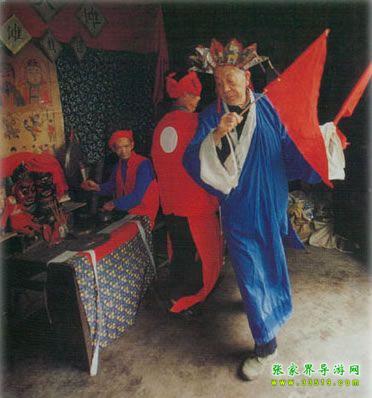 儺戲在湘西土家族地區(qū)也稱儺堂戲、儺神戲,它與土家族原始巫教、巫術(shù)的關(guān)系極為密切。土家族先民信奉的神有儺神、八部大神、土地神等,作為一種宗教活動,這種原始信仰與社會生產(chǎn)活動、文娛活動及民族習(xí)俗是融為一體的,因此儺戲最先的“沖儺還原”帶有明顯迷信色彩,土家族群眾中有“一儺沖百鬼,一愿了千神”的說法,湘西土家族人干脆叫它為“神戲”。湘西土家族儺戲的發(fā)展過程大體是儺、儺舞、儺儀然后才產(chǎn)生儺戲。儺舞源于久遠的蒙昧?xí)r期,土家先民們在同大自然作斗爭、同毒蟲猛獸作斗爭,便產(chǎn)生了化裝護面、在鼓樂聲中奔騰呼號、沖殺跳躍的原始儺舞,其所模擬的鳥雀舞、猿猴舞、熊舞等頗為壯觀。儺舞與儺這種驅(qū)鬼消災(zāi)的祭祀儀式結(jié)合后,增加了祈求人獸平安、五谷豐登、緬懷祖先、勸人去惡從善、以及傳播生產(chǎn)知識等內(nèi)容,這就逐漸形成了兼?zhèn)潢U弘教義及娛樂性質(zhì)的祭祀風(fēng)俗歌舞。[2]土家族儺戲就是在此基礎(chǔ)上發(fā)展起來的。部分土家族學(xué)者認(rèn)為土家族儺戲的遠源可以追溯到戰(zhàn)國時代的《九歌》,《九歌》是土家族儺戲的雛形,他們的依據(jù)是當(dāng)時楚國的沅湘流域,人們“信巫鬼、重淫祀”(《漢書·地理志》),從而使得“陰陽人鬼之間,又或不能無褻慢淫荒之雜”(宋代朱熹《楚辭集注》)。屈原正是加工整理了這一類“鄙陋”之詞,才創(chuàng)作出《九歌》、《天問》等名篇。也有部分學(xué)者不贊同這種論點,他們認(rèn)為土家族儺在宋代還停留在儺祭和儺舞階段,最遲到明代,土家族儺才發(fā)展成為儺戲[3]。嘉靖《常德府志》記載:“歲除,歲將盡數(shù)日,鄉(xiāng)村多用巫師,朱裳鬼面,鑼鼓喧舞竟夜,名曰還儺。”文中未點明“儺戲”二字,但卻使用了“還儺”一詞,這與今天民間對儺戲的稱呼相似。又據(jù)清乾隆《永順縣志》載:“永俗酬神,必延辰郡巫師唱演儺戲,……至晚,演儺戲。敲鑼擊鼓,人各紙面一,有女裝者,曰孟姜女;男扮者,曰范七郎。”在土家族儺戲中,孟姜女傳說故事占著非常重要的地位。在湘西土家族地區(qū),儺戲一般有二十四正戲,即二十四戲神。每次儺儀結(jié)束時,巫師要用香火在黃裱紙上燒二十四個洞,以表示奠祭二十四戲神。民間有諺語:“儺神菩薩不識字,只要二十四個圈圈滿。”在二十四儺神中,被稱為勾愿神的姜女、范郎是還儺愿時非常重要的兩位神靈。在儺戲中,《孟姜女》是整場的高潮,平時,儺戲唱完后,由沒下裝的孟姜女、范郎去向主人家及觀眾“拜臺”,以示“了愿”。清代中期以后,儺戲吸取了花燈、陽戲、高腔等其他地方戲劇劇種的唱腔和劇目,逐漸變得日益成熟。我們仔細查看了全國371個劇種,發(fā)現(xiàn)儺戲、花燈戲有著相同的班社,也就是說一個演出班社可以演出儺戲、花燈戲兩個劇種。這段時期,儺戲已作為獨立戲劇劇種參加演出。由于儺戲是由巫儺法事演變而成的戲劇形式,經(jīng)歷著巫儺法事(驅(qū)鬼祭祀)、儺壇上戲和儺堂正戲的發(fā)展過程。