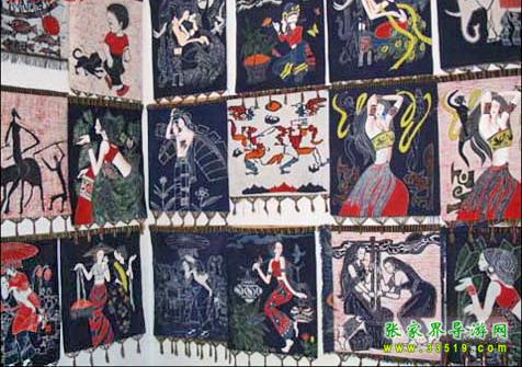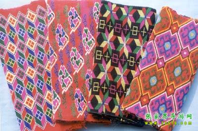 織錦。又名“西蘭卡普”、“土花鋪蓋”,為土家族傳統(tǒng)工藝品之一,是森林公園工藝品廠的主要產(chǎn)品。織錦是在特制的本質(zhì)織機上以錦紗為經(jīng)、五彩絲線為緯、手工提花織成。以其質(zhì)地厚實、堅韌,色彩鮮艷,格調(diào)古樸,流暢生動著稱。圖案有花草、鳥獸、生產(chǎn)、生活、幾何、字樣等種類。為舊時土家姑娘必備嫁妝之一。據(jù)考證,早在漢代,土家織錦就作為方物貢入漢室宮廷。20世紀后,土家織錦曾漂洋過海至日、美、英等國展出,并作為禮品,被國家領導人贈送給外國元首及政府官員,如今織錦以壁掛、枕巾、沙發(fā)墊、桌圍、提袋、服飾等多種式樣遠銷世界各地。