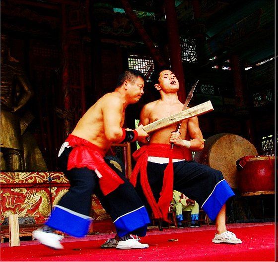 大庸氣,堪稱武林奇葩,曾為祖國贏得聲譽(yù),海內(nèi)外享有極主名望。 大庸氣功是大庸各民族特別是土家族傳統(tǒng)體育項(xiàng) 目之了,分健體氣派、武術(shù)氣功兩類。前者有“返還 功”、“馬王推氣功”、“少林達(dá)摩醫(yī)療保健氣功” 等;后者有靜坐、壁虎、靈子、二指彈、碎石、松靜 、硬氣、五禽、五陽功等,尤以硬氣功著稱。大庸硬 氣功,歷史悠久,漢代相單程,明代覃后,清代劉明 燈,當(dāng)代湯子模、周鐵鞭、杜心武、趙繼書等都具有 超人硬氣武功。大庸土著民族在漫長的反征服、反壓 迫斗爭,博采武當(dāng)、少林南北派、昆侖派眾家武林精 華,創(chuàng)造出獨(dú)此一家的大庸硬氣功。 據(jù)傳,大庸硬氣功鼻祖是楚國鬼谷子?!队蓝h 志》有關(guān)鬼谷子隱居天門山鬼谷洞潛心學(xué)《易》、傳 授方術(shù)的記載。到清代有武林高手朱茂嶺,隱居三岔 村北芭蕉灣洞,研究鬼谷氣功之術(shù),后收西溪坪胡口 子、余世萬(即“余通人”)為徙,傳其衣缽。余通 人將武術(shù)氣功系統(tǒng)整理,發(fā)揚(yáng)光大,播名于世。 新中國成立后,黨和政府十分重視民間氣功發(fā)掘 整理,并正式列為體育項(xiàng)目加以普及發(fā)展,今日大庸 市習(xí)練硬氣功達(dá)數(shù)萬人眾。永定區(qū)官黎坪村世有“硬 氣功之鄉(xiāng)”盛譽(yù),該村男女老幼,練功已蔚成風(fēng)氣, 其武師趙繼書,1979年先后參加全省和全國武術(shù)大賽 ,均獲一等獎,受到國家體委重視,同年7 月趙繼書 專程到北京給中央領(lǐng)導(dǎo)同志匯報表演。嗣后,隨同中 國武術(shù)代表團(tuán)和國家領(lǐng)導(dǎo)人先后兩次出國,到盧森堡 、意大利、比利時、羅馬尼亞、馬其他和東南亞等國 家訪問。他表演的臥刀碎石、頭頂開石、雙鳳灌耳、 頭碰石柱、叉尖推磨等精彩節(jié)目,博得外國友人好評 。盧森堡一位榮獲國家獎牌的武士,看了表演后連夜 來到中國大使館,將自己珍藏多年的獎牌贈送給他; 盧森堡國王主動熱情走上臺與趙繼書熱情擁抱,連連 稱贊:“了不起!了不起!國際氣功大師!”并把珍 藏紀(jì)念章一枚贈送給趙繼書。一位法國朋友十分贊賞 說:“中國的氣功,稱為全人類的寶貴財(cái)富,是有科 學(xué)道理的。”自此,大庸硬氣功譽(yù)滿全球。湖南瀟湘 電影制片廠專門拍攝了彩色紀(jì)錄片《大庸氣功》。 大庸硬氣功共有二十多個項(xiàng)目,最有影響的是: 腹臥鋼叉 由二人在地面扶住一根叉尖朝上的三 股鋼叉,叉尖猁鋒利,然后一個俯身叉尖,尖抵腹部 ,待其四肢平展懸空,扶叉二人轉(zhuǎn)動鋼叉,謂之推磨 。表演時,要求臥叉者運(yùn)氣于腹,氣意集中,稍有大 意,叉即穿腹而過。 臥刀破石 先固定兩把大刀,刀口朝上,臥刀者 運(yùn)氣后,由其他人抬臥于刀口上(有仰臥、俯臥兩種) ,然后在臥刀者腹部或背部置一碩大石條(約數(shù)百斤) ,一人或兩人輪大鐵錘狠擊石條直至斷裂破碎為止。 釘?shù)洞财剖?地上倒一層碎玻璃片,一人仰臥其 上;然后腹上置釘床,又一人仰臥釘床上,再于第二 人腹上置釘床,第三人仰臥刀床上,腹部上壓一塊數(shù) 百斤大條石,由人掄錘狠砸,至石破為止。 銀槍刺喉 用一根兩頭安有鋒利槍頭的鋼槍,抵 置兩位表演者喉部,然后相對發(fā)力,至槍桿抵成彎弓 形而喉部安然無恙。 徙手?jǐn)嗍?表演者將堅(jiān)滑如鐵一塊卵石置于石凳 (地)上,然后運(yùn)氣于掌或指擊斷(碎)卵石。 踢腿斬石 表演者運(yùn)氣于腿,以腿踢斷石條。一 般可踢斷15公分以上厚度的麻石條或青石條。 胸部打刀 將鋒利大刀刃口置于胸部肌肉上,用 一根拳頭粗木棒猛擊刀背,至棒斷而胸部無傷。 新中國成立以來,大庸民間武術(shù)與民族體育逐漸 融為一體,發(fā)揮著提高人民身體素質(zhì)、弘揚(yáng)中華武術(shù) 傳統(tǒng)和增進(jìn)國際友誼重大作用。除硬氣功外,還有數(shù) 十種武術(shù)形式散見于民間武術(shù)體育活動之中。如打飛 棒、扭扁擔(dān)、抵搭斗杠、擠油渣、甩抱腰、舉石鎖、 板牛角(一種斗牛形式)等等。其特點(diǎn)是因地制宜, 不分場地,凡田園地角院壩集鎮(zhèn),都是習(xí)武練功、開 展活動的處所,頗具泥土氣息。擬或以生活中某些動 作和動物的某種形態(tài),稍加模仿演繹,便成某一獨(dú)特 武術(shù)形式。如天門武術(shù)功夫大師余道人所創(chuàng)造的“宮 天梳”、“巖燕樸天門”等;也有就地理特點(diǎn)創(chuàng)造某 種武功形式的,如“蕩藤”等。