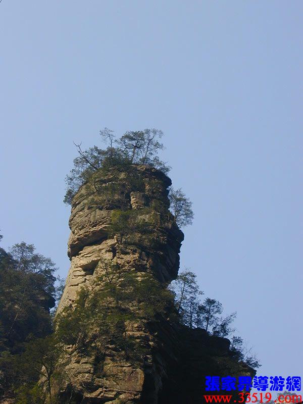 (金鞭巖、神鷹護鞭)如果要問張家界國家森林公園的標(biāo)志景點,答案是現(xiàn)成的:金鞭巖。早在清代中期,一些文人就把張家界的峰林及百丈峽列入“永定八景”。其一叫“危峽啼猿”;其二叫“層巖涌塔”:“縣西二十里青崖山,其前五山并立,層峙如浮圖。中一峰更峻拔,上插宵漢,晴輝雪積,最擅奇觀。”這里說的“其中一峰”,指的金鞭巖。八大景點張家界占其二,可見先人是有眼力的。金鞭巖相對高度380多米,拔地而起,直插云霄,無論你遠看近看,正看側(cè)看,都是一根刺破青天的長鞭!在金鞭巖左側(cè)的那座巖峰,大家看多像一只兇猛的老鷹,勾嘴瞪眼,雙翅略展,時刻警覺地守護著金鞭,人稱“神鷹護鞭”。
