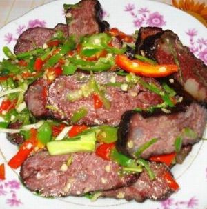 介紹: 血豆腐,就是將豆腐和豬血、豬肉及花椒、辣椒等佐料拌成泥狀,捋成卵形,以竹篩置火炕上,煙熏烤成臘黃,吃起來耐嚼味香,是土家特色菜,當(dāng)?shù)厝顺R云湎戮啤?在張家界的飯館里很難吃到正宗的土家特色菜,可以去做土味的特色餐館去解解饞。但是最正宗還是鄉(xiāng)下人家家里自己熏的,那才叫一個(gè)好吃!?。?/p>