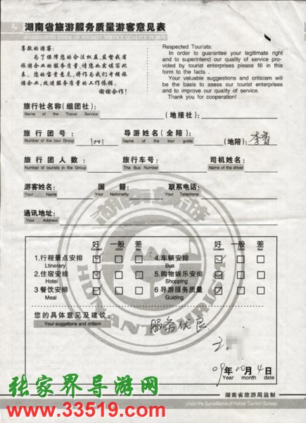 2009年10月1日王先生一行質量接待反饋單: